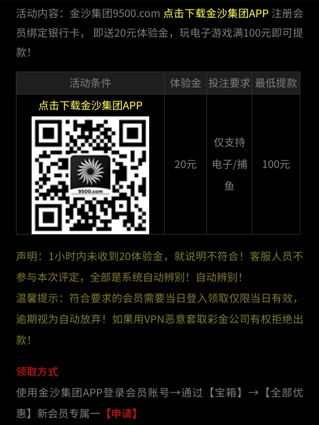 新用户下载注册完善资料宝箱里自助申请20,一个小时左右再去宝箱里领取。不送就是不符合