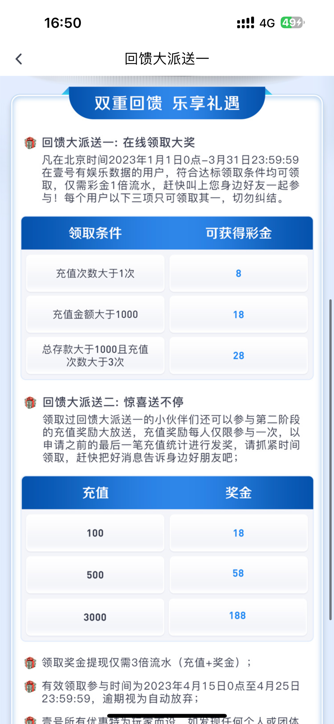 领完回馈彩金的老用户/还可以参加回归充值送活动