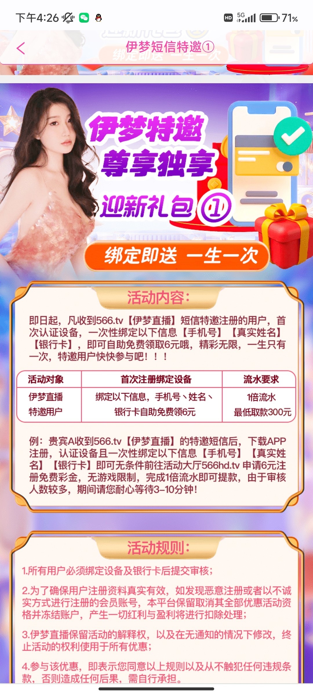 新用户注册绑卡自助申请送6/300提现。