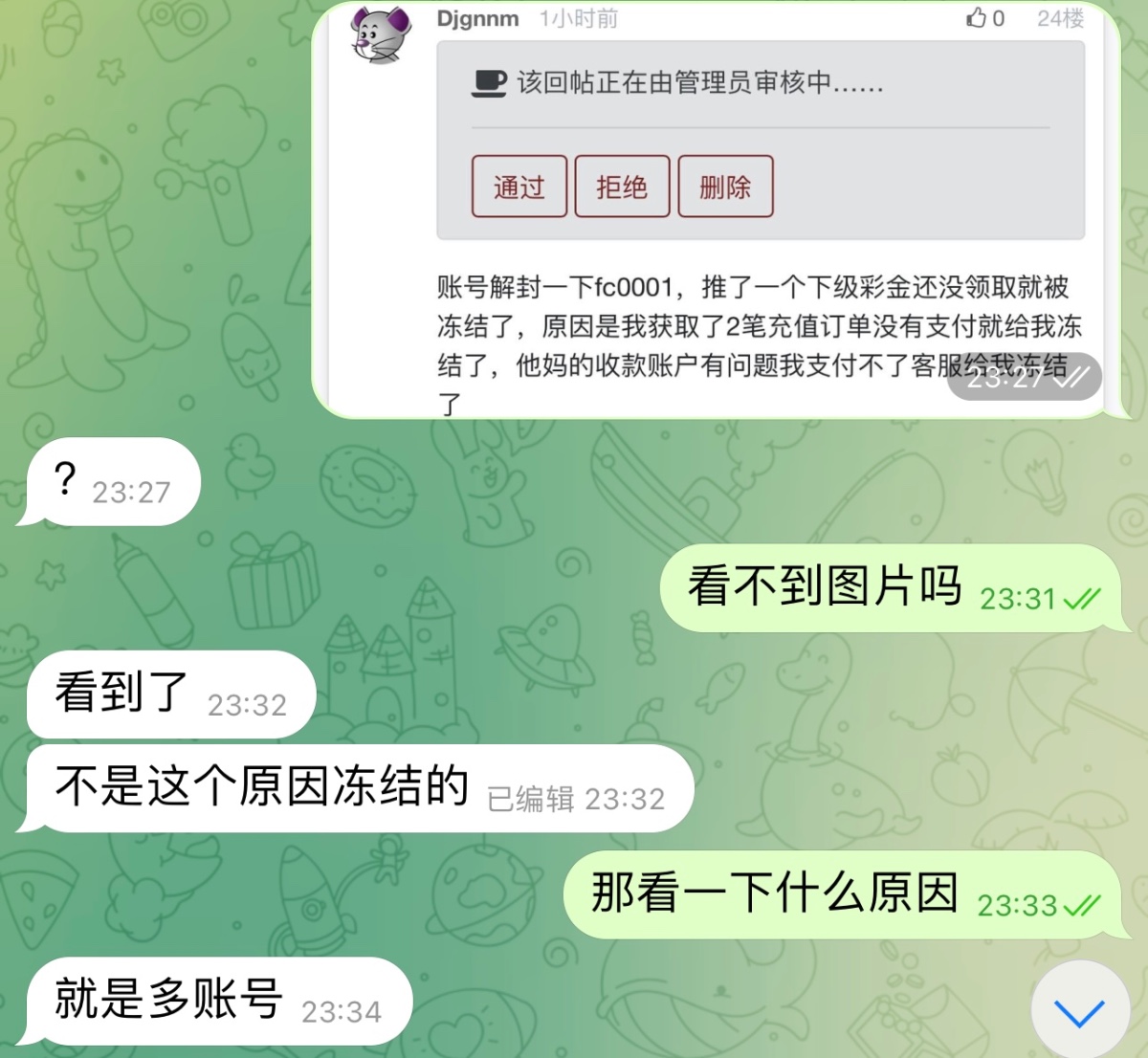 Djgnnm 账号解封一下fc0001,推了一个下级彩金还没领取就被冻结了,原因是我获取了2笔充值订单没有支付就给我冻结了,他妈的收款账户有问题我支付不了客服给我冻结了