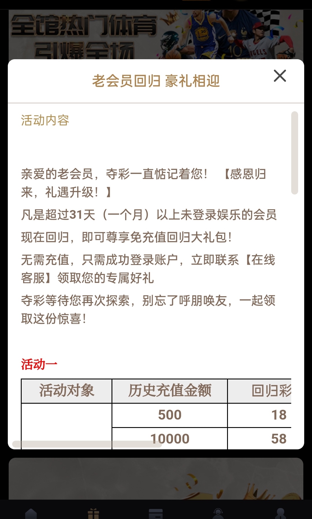 老用户历史500+的31天未登录联系在线客服申请回归彩金,具体看活动图吧
