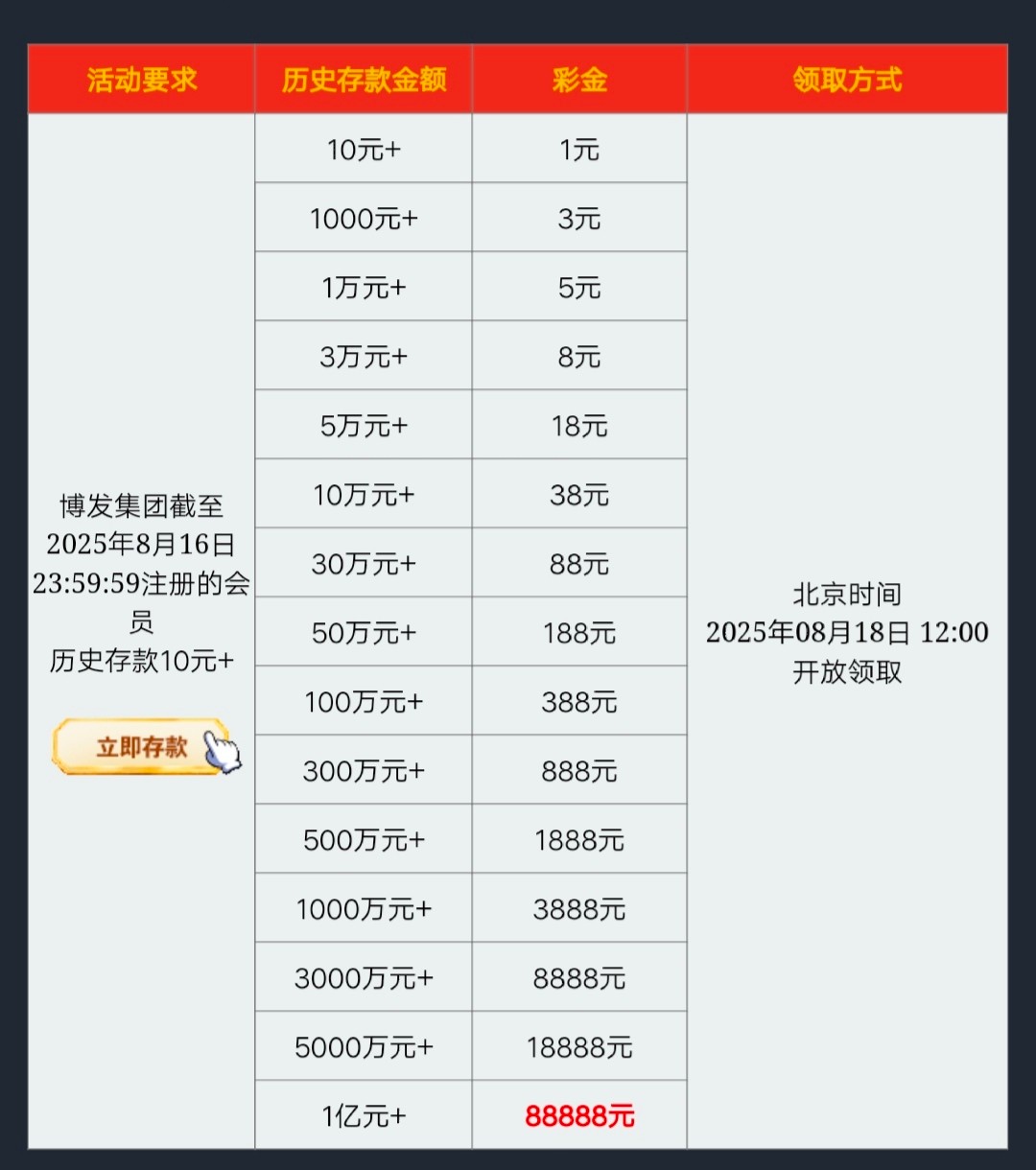截止8月16日23:59前注册的会员,享有8元/18元的回馈金,出款流水详情看规则介绍;
