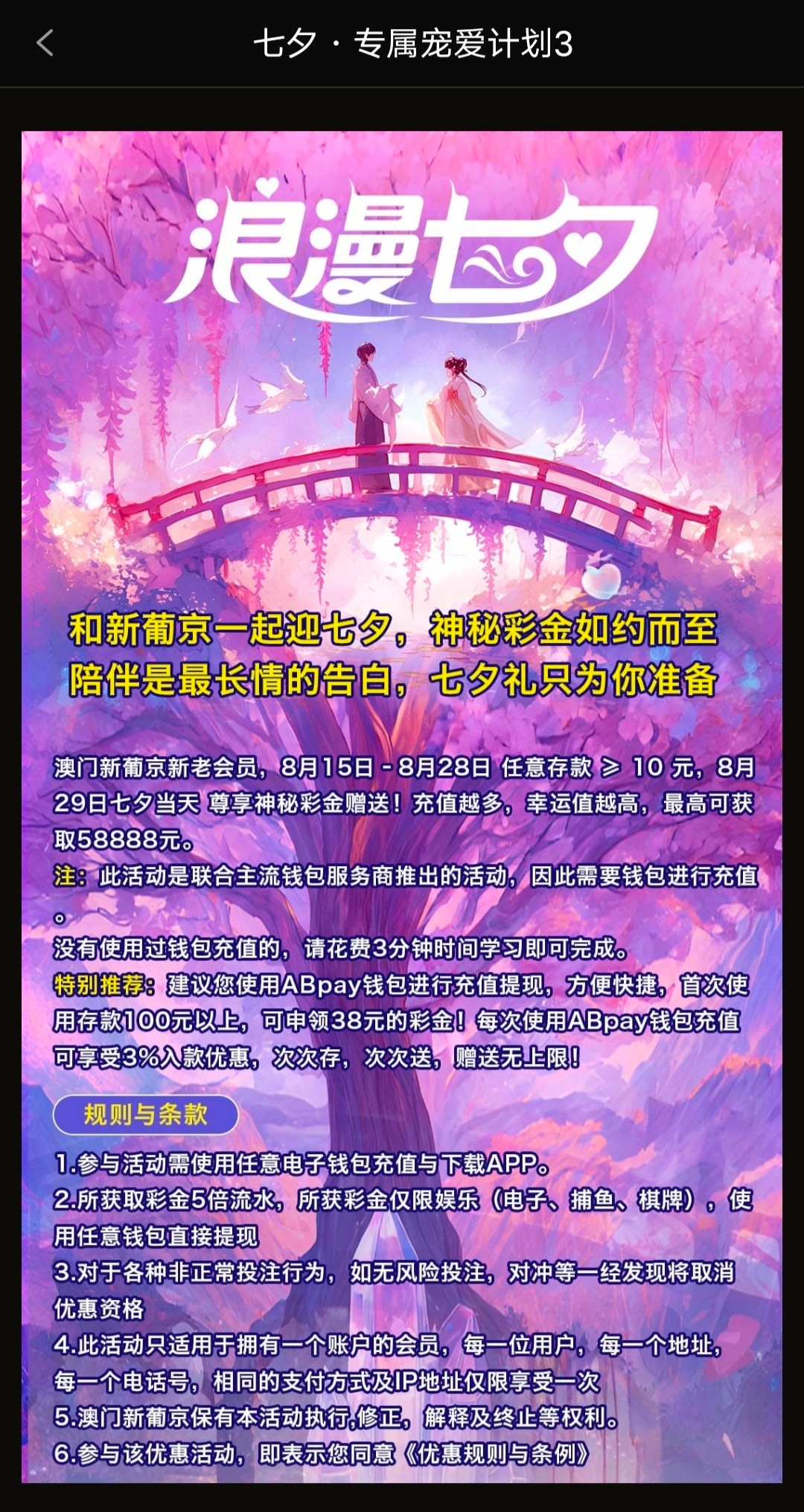 8月15-8月28日,任意存款≥10元,七夕当天尊享神秘彩金赠送,充值过的可以登录去看看,没有无视。