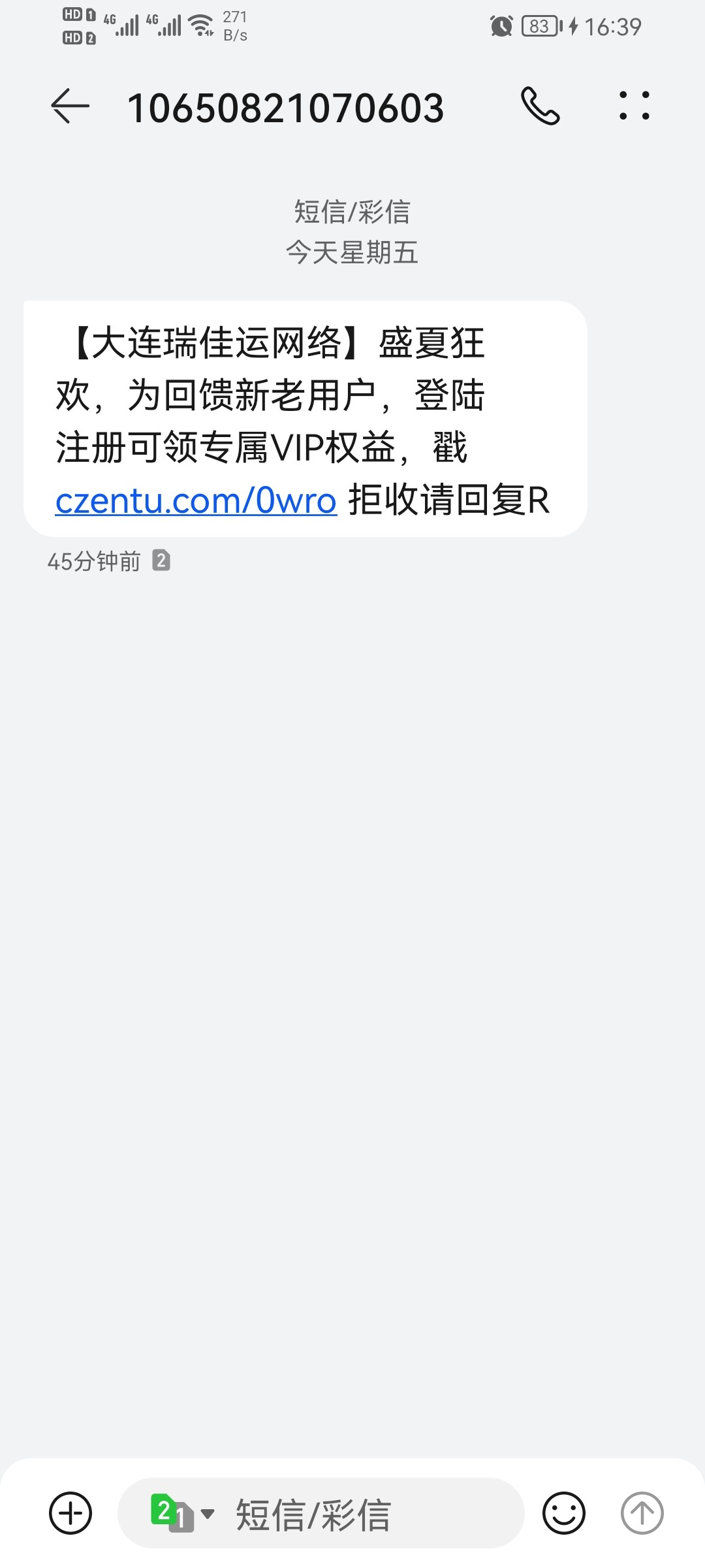 短信链接:【大连瑞佳运网络】盛夏狂欢,为回馈新老用户,登陆注册可领专属VIP权益,戳 czentu.com/0wro 拒收请回复R a333.app 送18 200提,