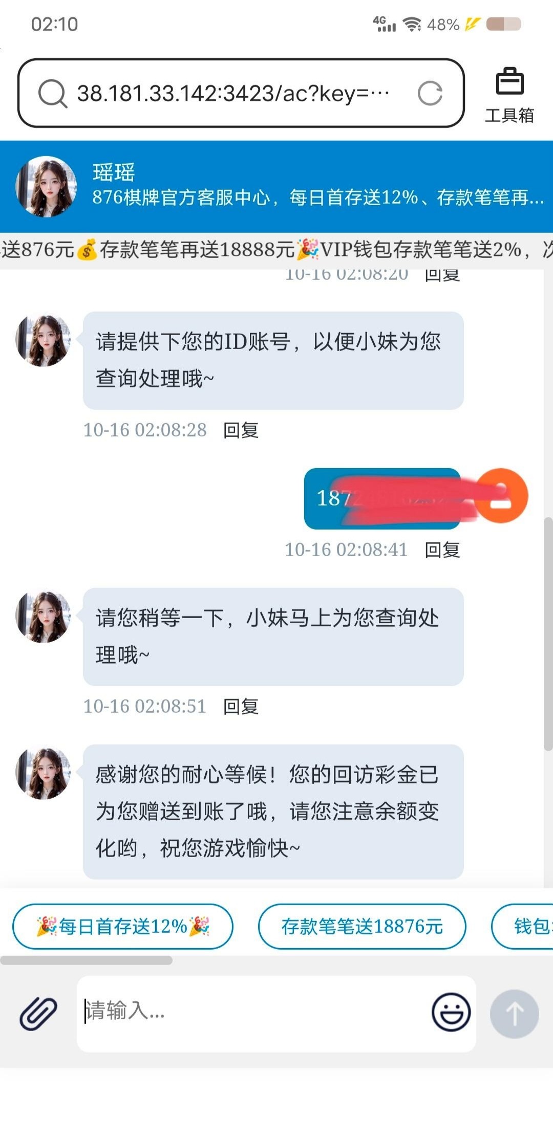876又可以碰瓷回访彩金了 一个月送三次 注册过有账号的去碰瓷吧
