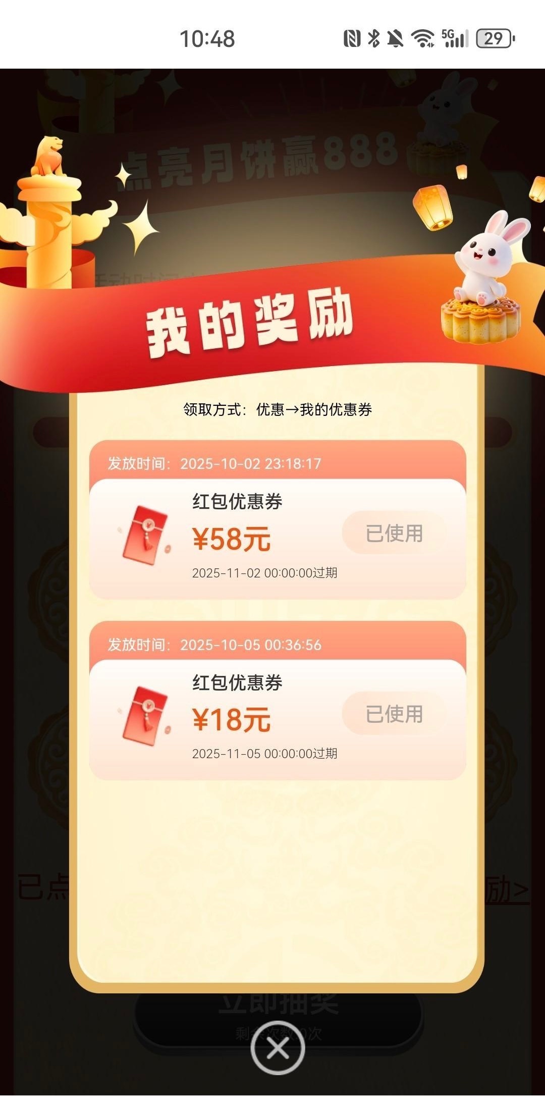 这个月充值过,并且在会员日抽奖过的,去优惠里面开月饼,好像最低18