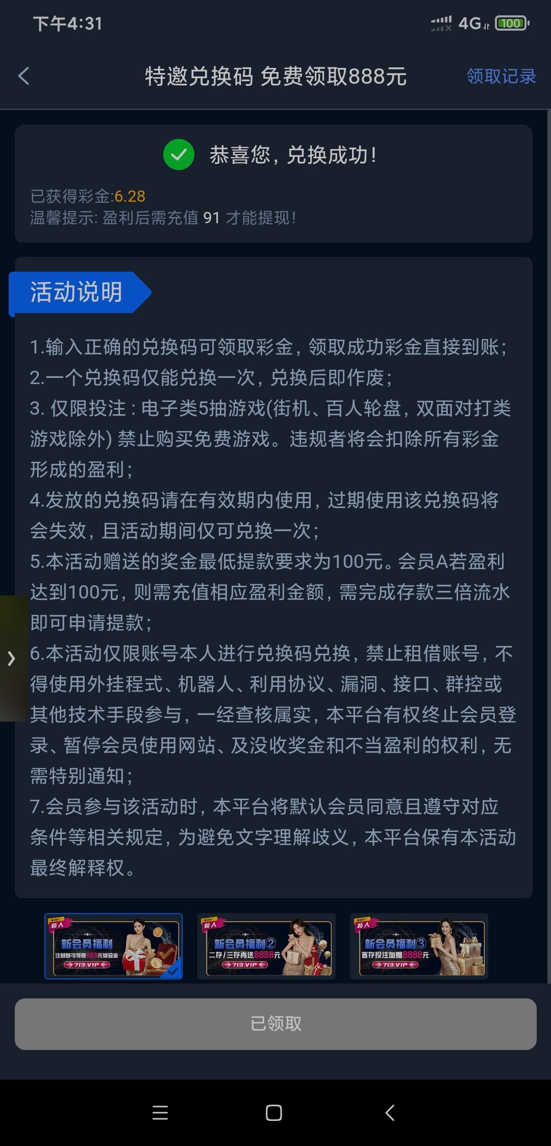 免费代码8-88:需要完成代码的10倍水,盈利多少必须充值多少完成1倍打码,才可以提款。只能PG/WG电子游戏此台放心即可