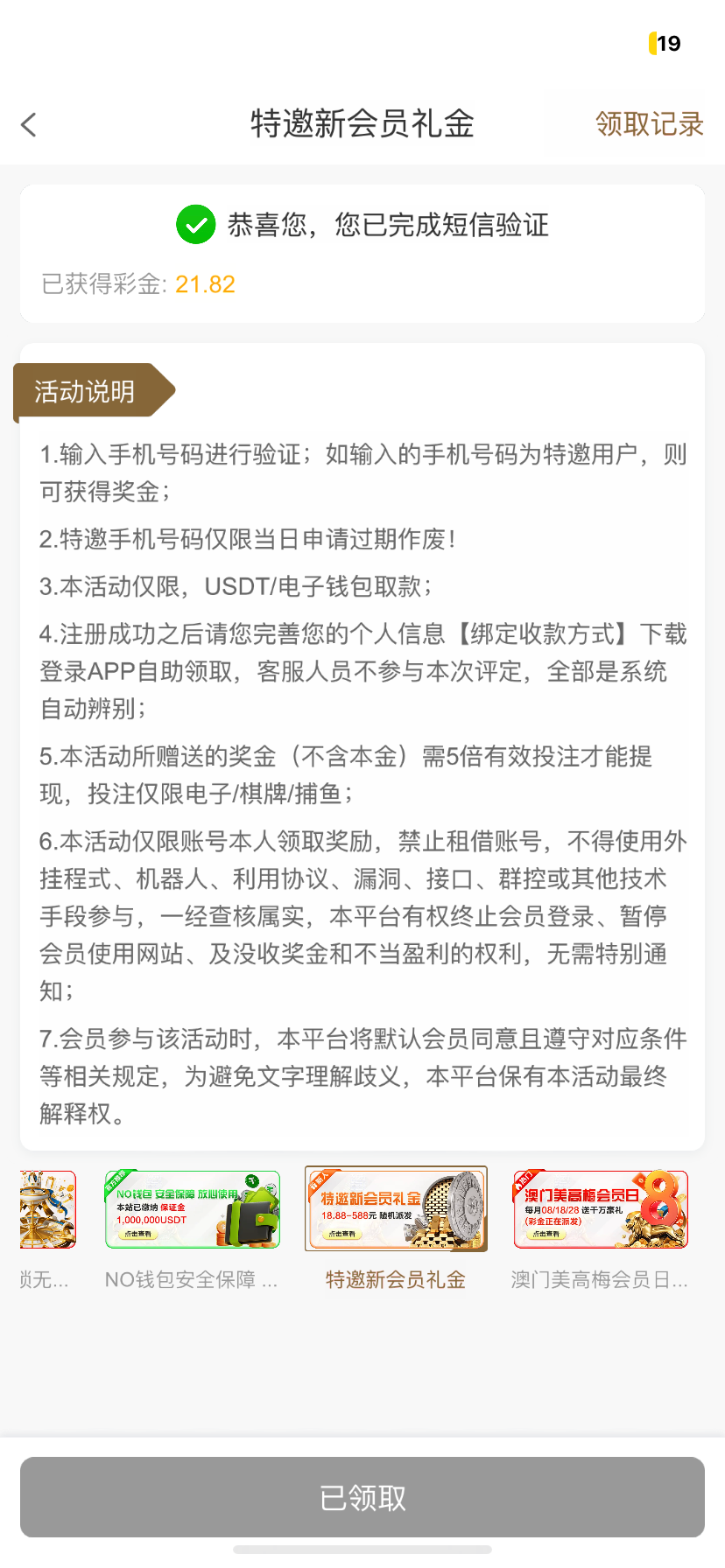 领取自助彩金五倍流水。得吃
