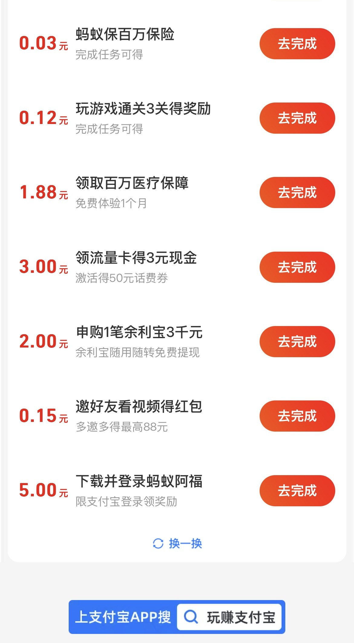 首页搜“玩赚支付宝”,下方有个任务没看到的就换一换就看到了 “下载登录蚂蚁阿福”。完成后可得5元