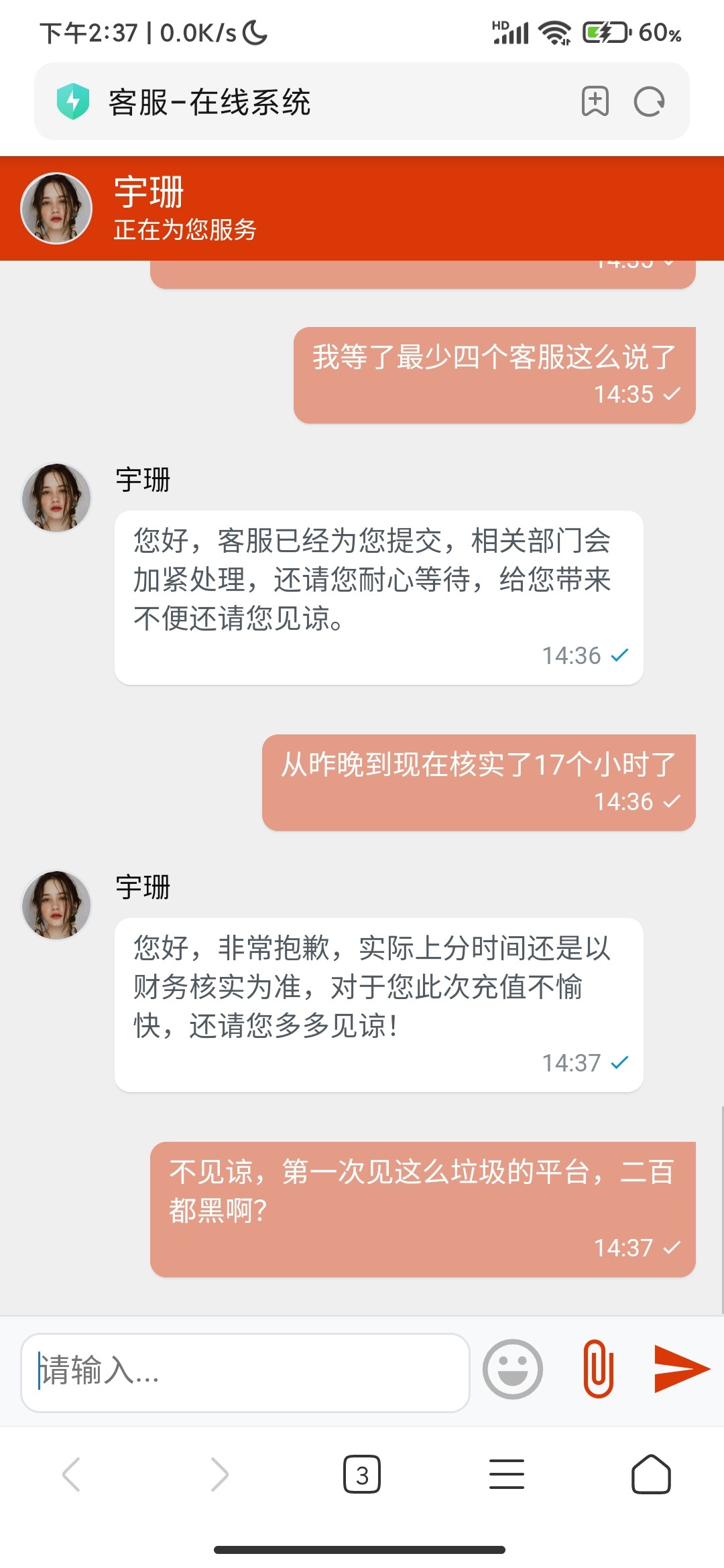昨晚在九五娱乐用数字RMB充值二百,到现在都没到账,找了四五个客服机械式回答,让等着。