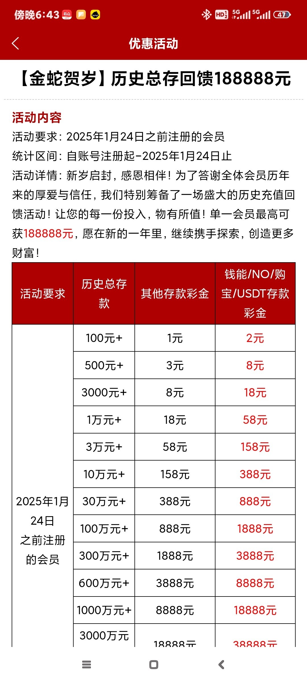 我们进入正题,根据精彩系的回馈历史来看,春节大概率是历史总存款回馈了,运气好些,还能有个对应年份的注册彩金26+26。
