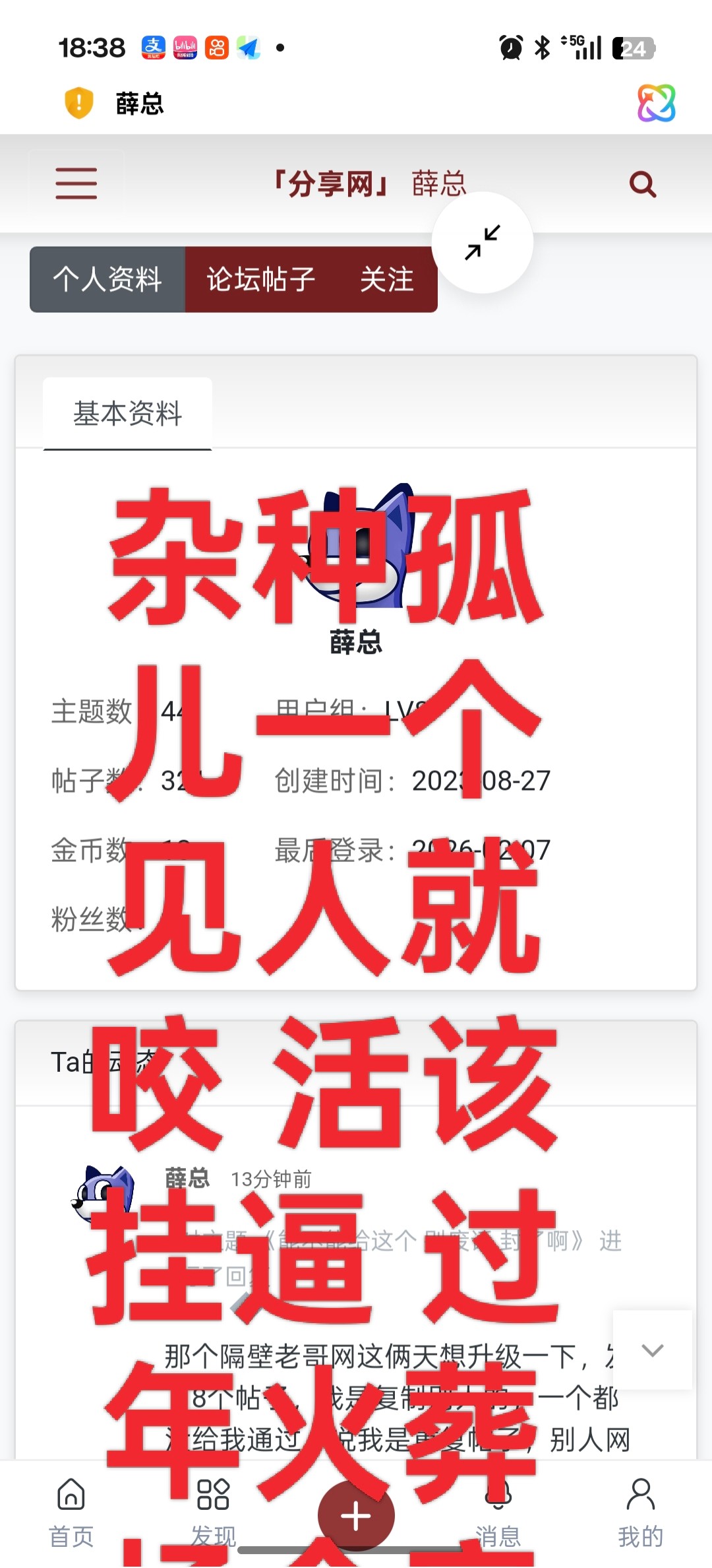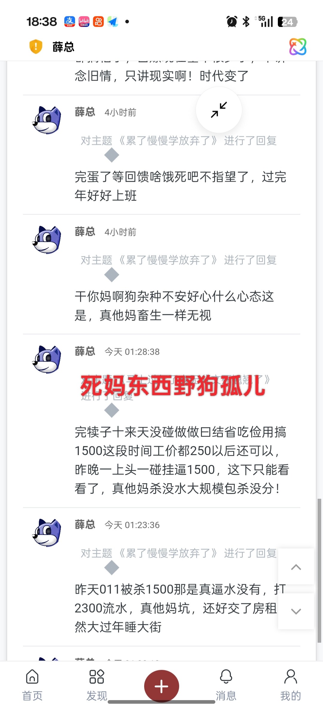 薛总 狗杂种别人发出来多久了才发,基本都是黄的没一点营养,一直刷来刷去当老子眼瞎,看你这狗老子都烦