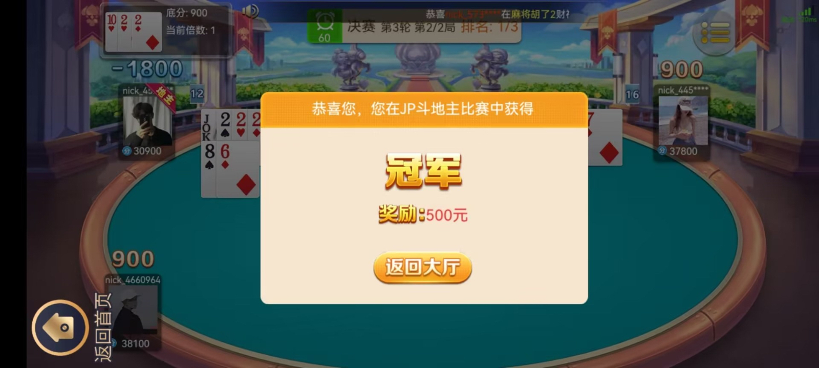 每天jp斗地主免费比赛三场,15/21/22,第一名送500其余名次看活动